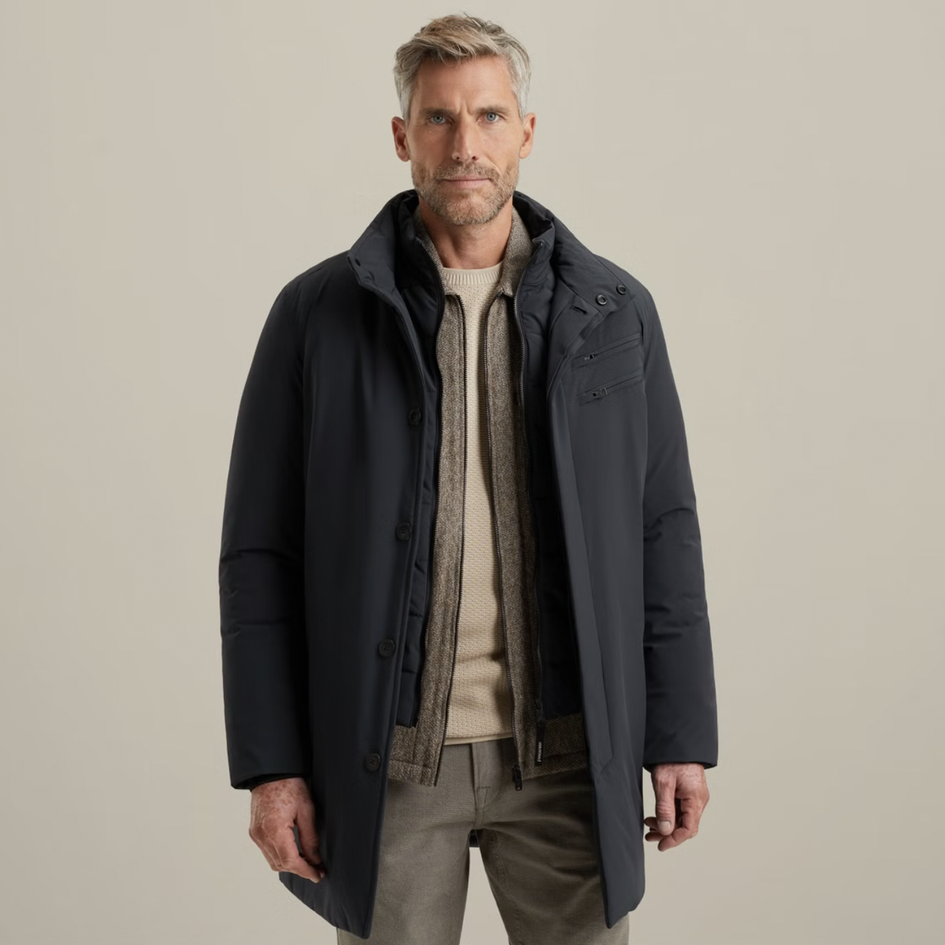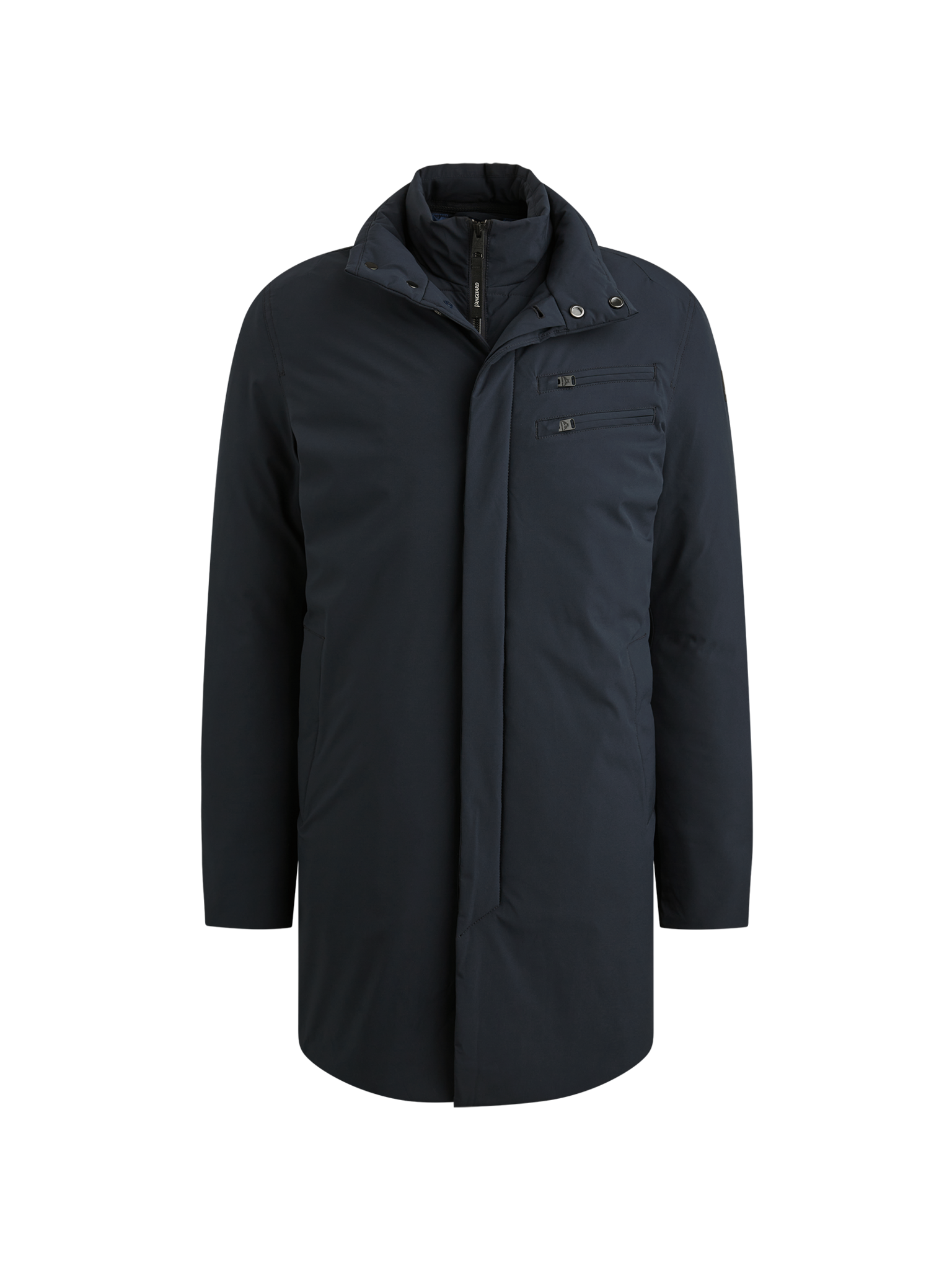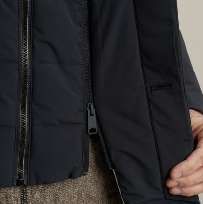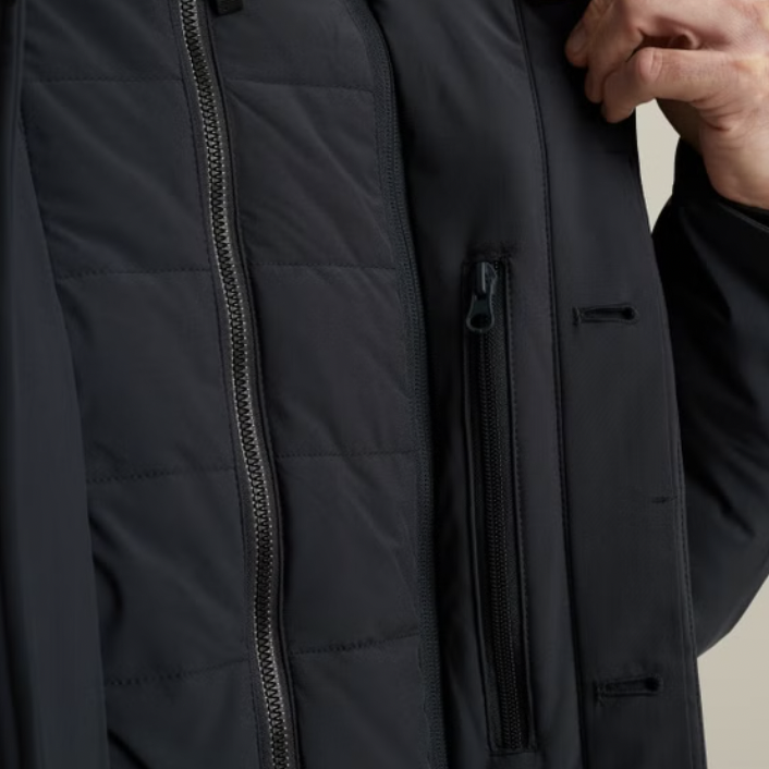 Hij is voorzien van twee zijzakken met fleece voering en drukknopen, twee borstzakken met rits en een binnenzak met rits.
