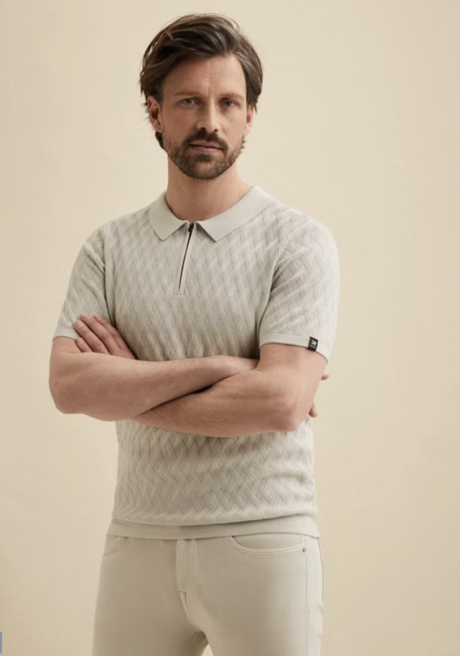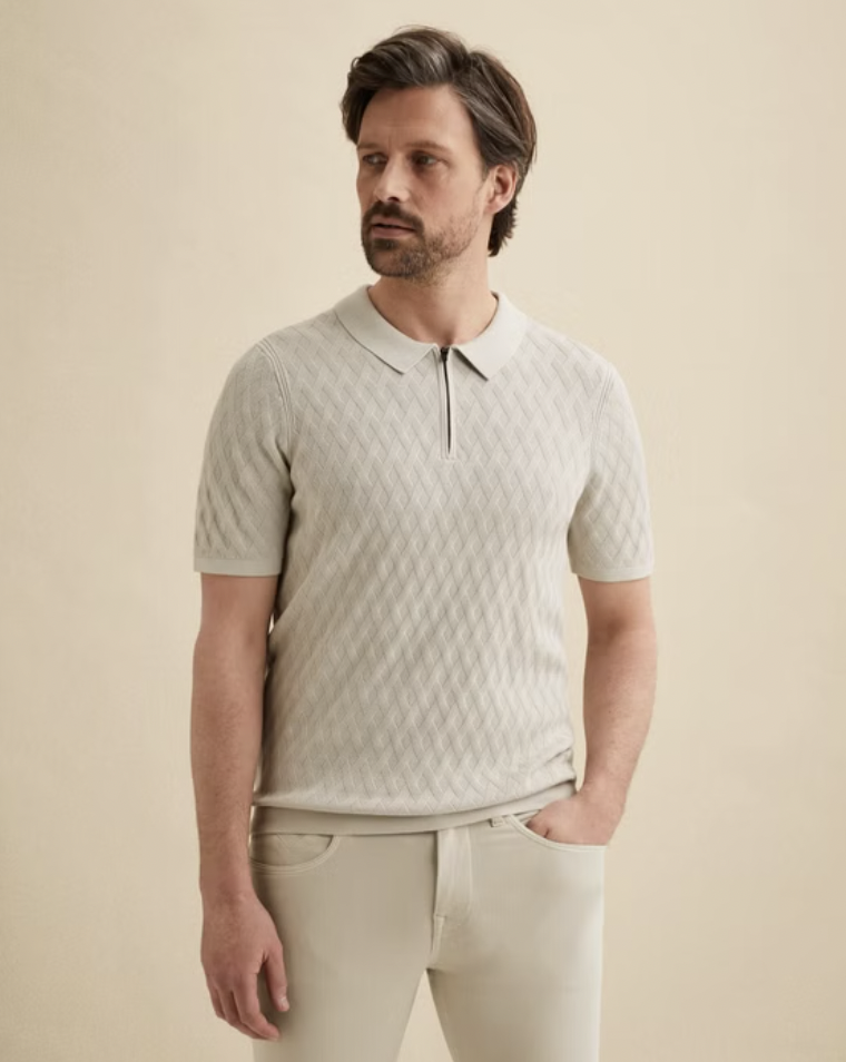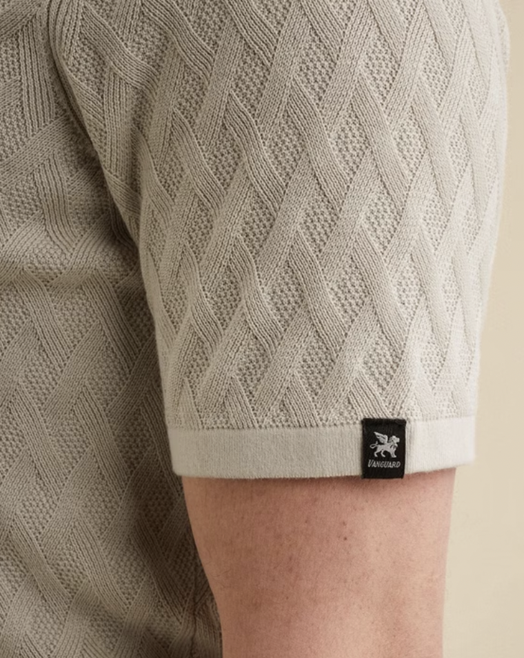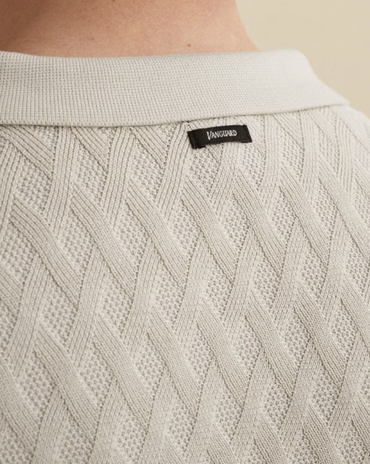 Deze gebreide Vanguard polo is gemaakt van katoen/modal en uitgevoerd in een iets grovere breistructuur.
