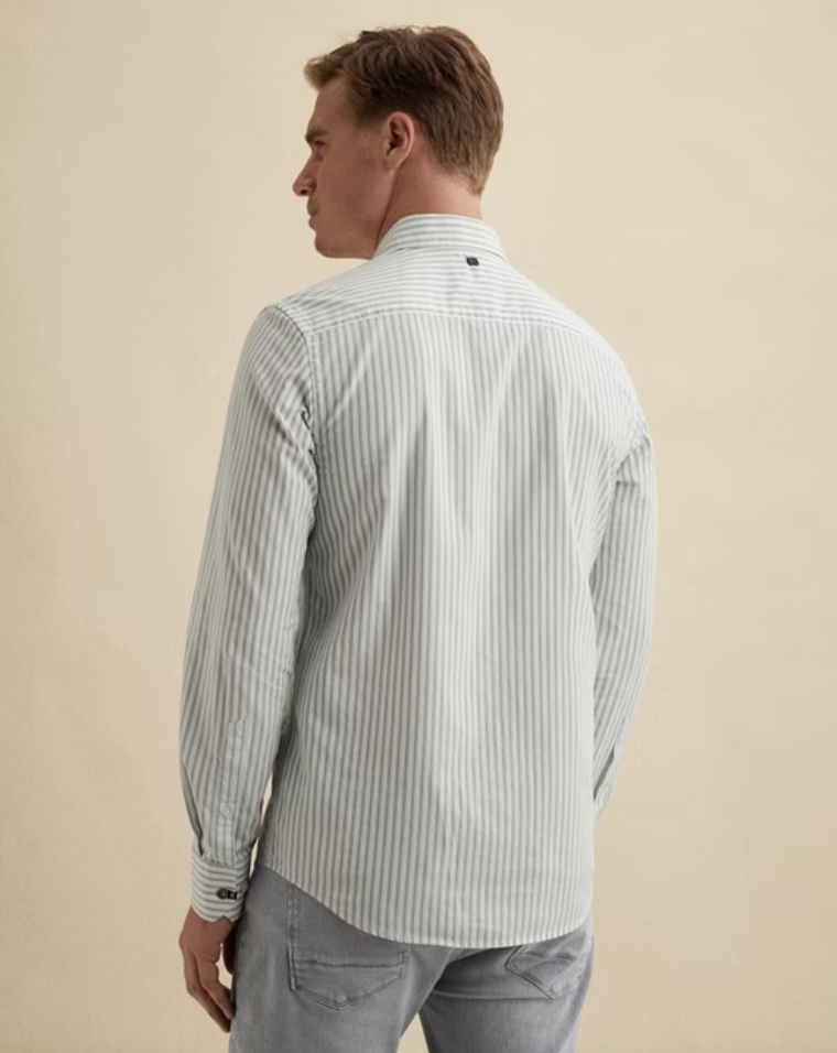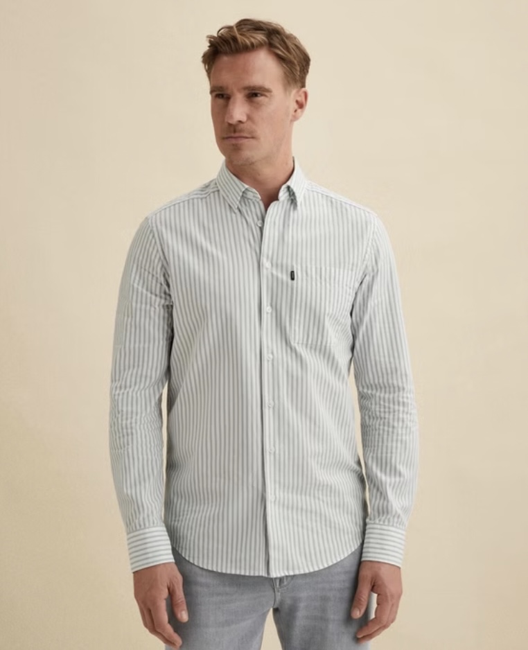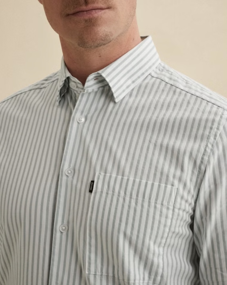 Dit Vanguard overhemd met verborgen button-down kraag is gemaakt van een stof met een fijne structuur en een eigentijds streeppatroon.
